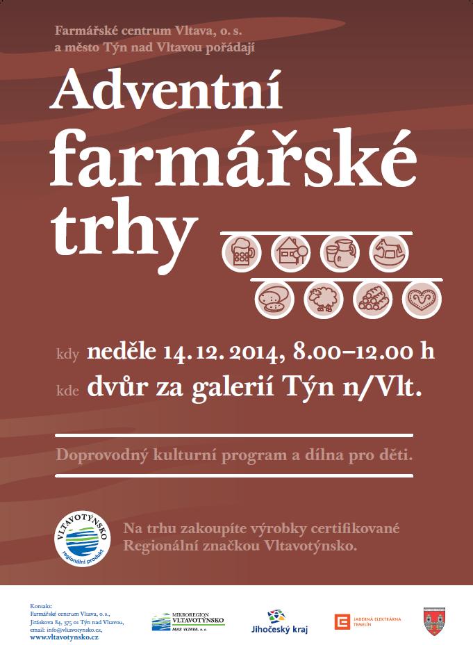 Advent již pomalým tempem ukrajuje dny, které nás dělí od Vánoc. Pokud si chcete zpříjemnit předvánoční dobu, můžete třeba navštívit Adventní farmářské trhy, které se konají 3. adventní neděli 14.12.2014 od 8 do 12 hodin na jarmarečním prostoru za galerií v Týně nad Vltavou. A co Vás zde čeká? Kromě toho, že si zde můžete zakoupit mj. i výrobky certifikované Regionální značkou Vltavotýnsko, je pro návštěvníky připraven také doprovodný kulturní program a dílna pro děti. V příloze naleznete pozvánku. Přejeme klidné a pohodové prožití doby adventní a těšíme se na setkání s Vámi!