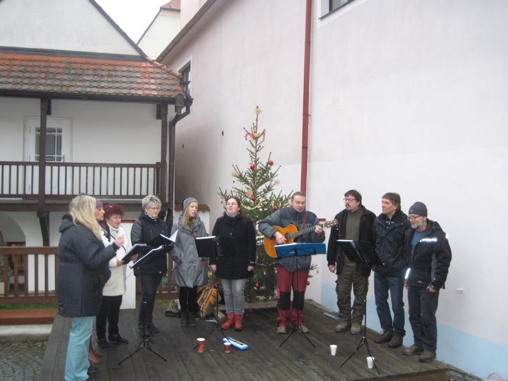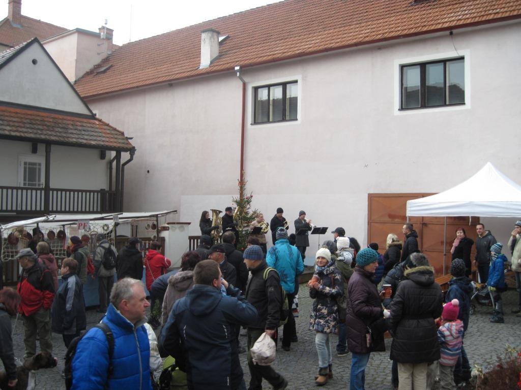 Třetí adventní neděle dopoledne je v Týně nad Vltavou již tradičně spojena s Adventními farmářskými trhy, které patří mezi nejúspěšnější trhy v roce. Svou osobitou atmosférou a nekomerčním pojetím dokáží každoročně oslovit nejen stovky návštěvníků, ale také několik desítek pravidelně se účastnících trhovců. A ti se prezentovali pestrou škálou kvalitních výrobků a produktů vč. adventní a vánoční výzdoby, svícnů, jmelí či dřevěných vyřezávaných betlémů. Zakoupit jste si mohli i čerstvé maso, ryby, zeleninu, zeleninové hořčice, šípkové produkty či med. Nechybělo ani pletené zboží, ručně malovaný textil, šperky, keramika, atd.. Vlezlou zimu bylo možno zahnat horkou medovinou, teplým jablečným moštem či teplým voňavým punčem, který jste si mohli podle chuti vylepšit i oříšky, rozinkami a ovocem. O příjemný hudební doprovod se tentokrát postarala Temelínská dechová hudba a vokální soubor Alleluja. Jedinou kaňkou na jinak vydařených trzích tak byl déšť, který zkrápěl celý jarmareční prostor během poslední hodiny. Ale naštěstí se jednalo jen o jemný deštík, který umožnil poklidný dojezd adventních trhů až do cílové rovinky. Nezbývá, než si přát, aby do cíle poklidně dospěl i celý letošní rok. Přejeme Vám klidné a požehnané vánoční svátky a úspěšný a pohodový Nový rok!