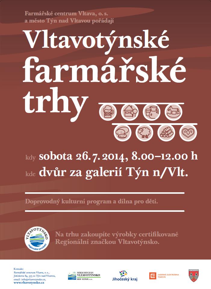V sobotu 26.7.2014 se od 8 do 12 hodin konají na jarmarečním prostoru za galerií v Týně nad Vltavou tradiční Vltavotýnské farmářské trhy, kde můžete mj. zakoupit i výrobky certifikované Regionální značkou Vltavotýnsko. Navštěvníky čeká také doprovodný kulturní program a dílna pro děti. V příloze naleznete pozvánku, těšíme se na setkání s Vámi!